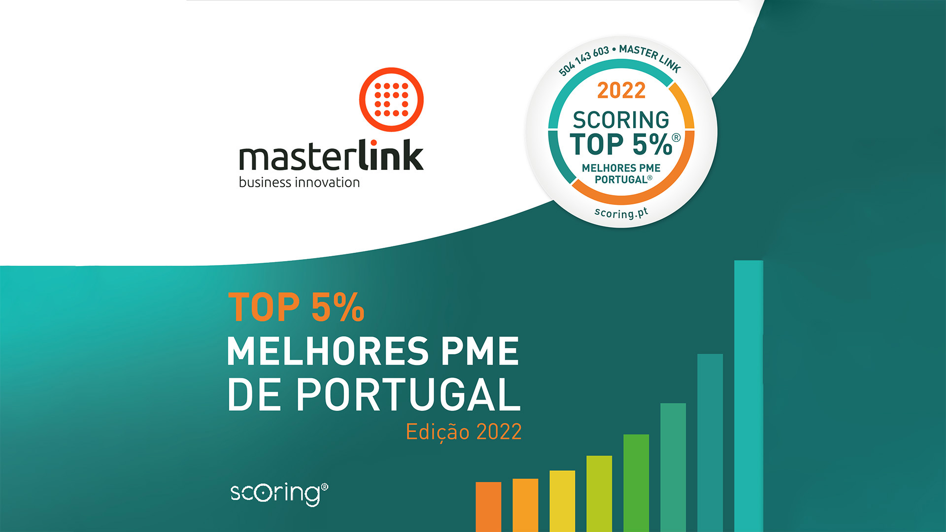 A Masterlink está no Top 5% das Melhores Pequenas e Médias Empresas (PMEs) em Portugal. A distinção da Scoring destaca o “Índice de Desempenho e Solidez Financeira (IDS) excelente” da Masterlink, que “evidencia “uma sustentabilidade financeira acessível apenas a 5% das PMEs nacionais”.